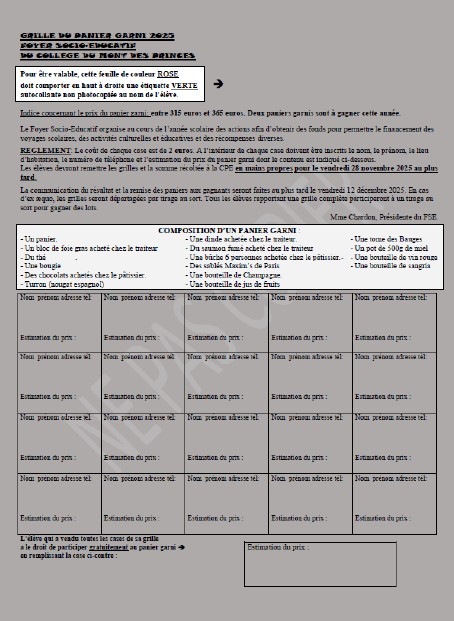 - Une grille de Panier garni pour faire parier (2€ la grille) sur le juste prix d'un panier. Le document est rose avec une étiquette verte au nom de l'élève.